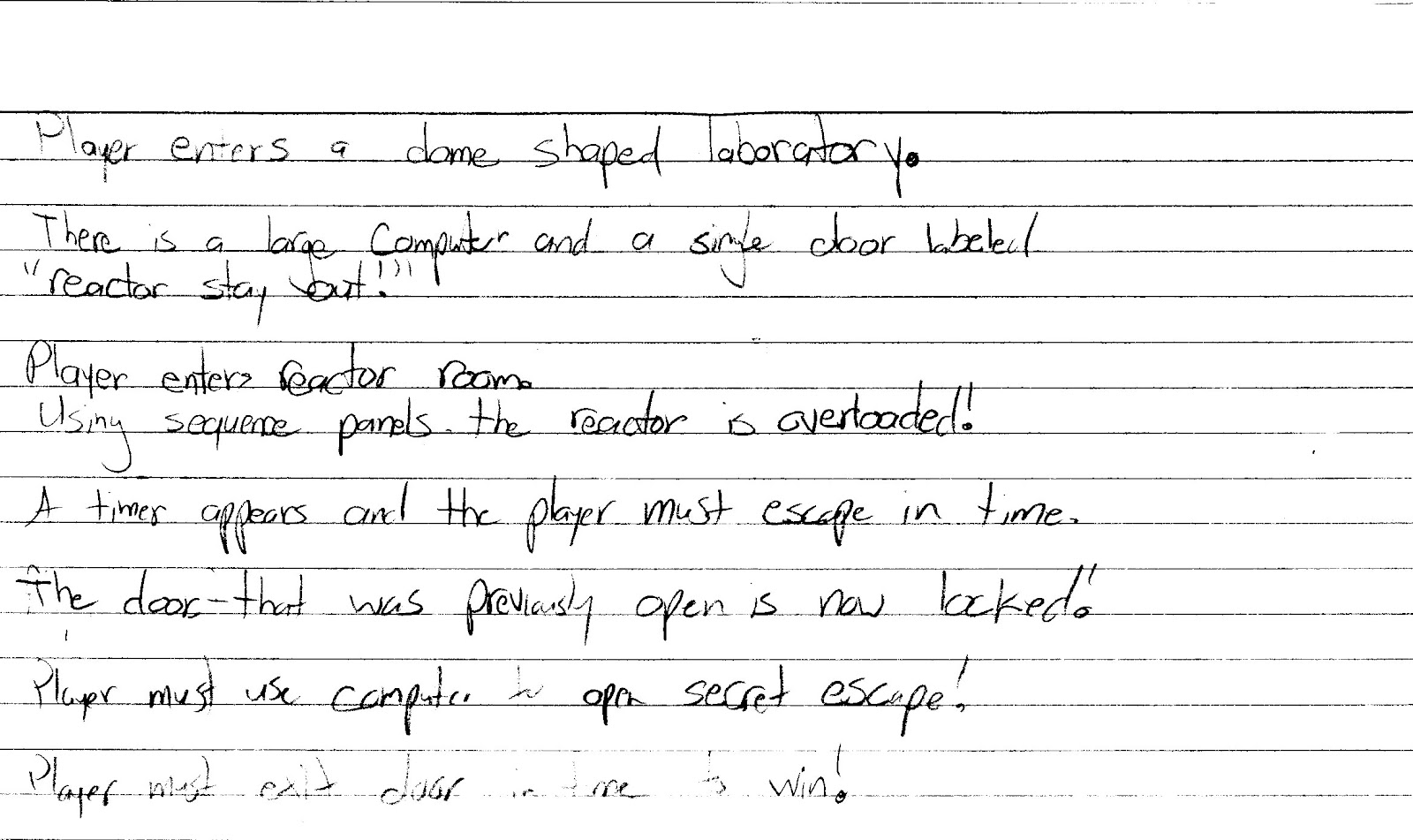 This was interesting to say the least because as I started to create my paper prototype I was really unsure on how I even wanted the level to look like. So after some brainstorming on blank paper I finally was able to put my ideas down and create the rooms and events I wanted. I really like the paper prototype stage and I feel that it really puts the project into perspective. Below is a picture of what the stage is going to essentially look like.